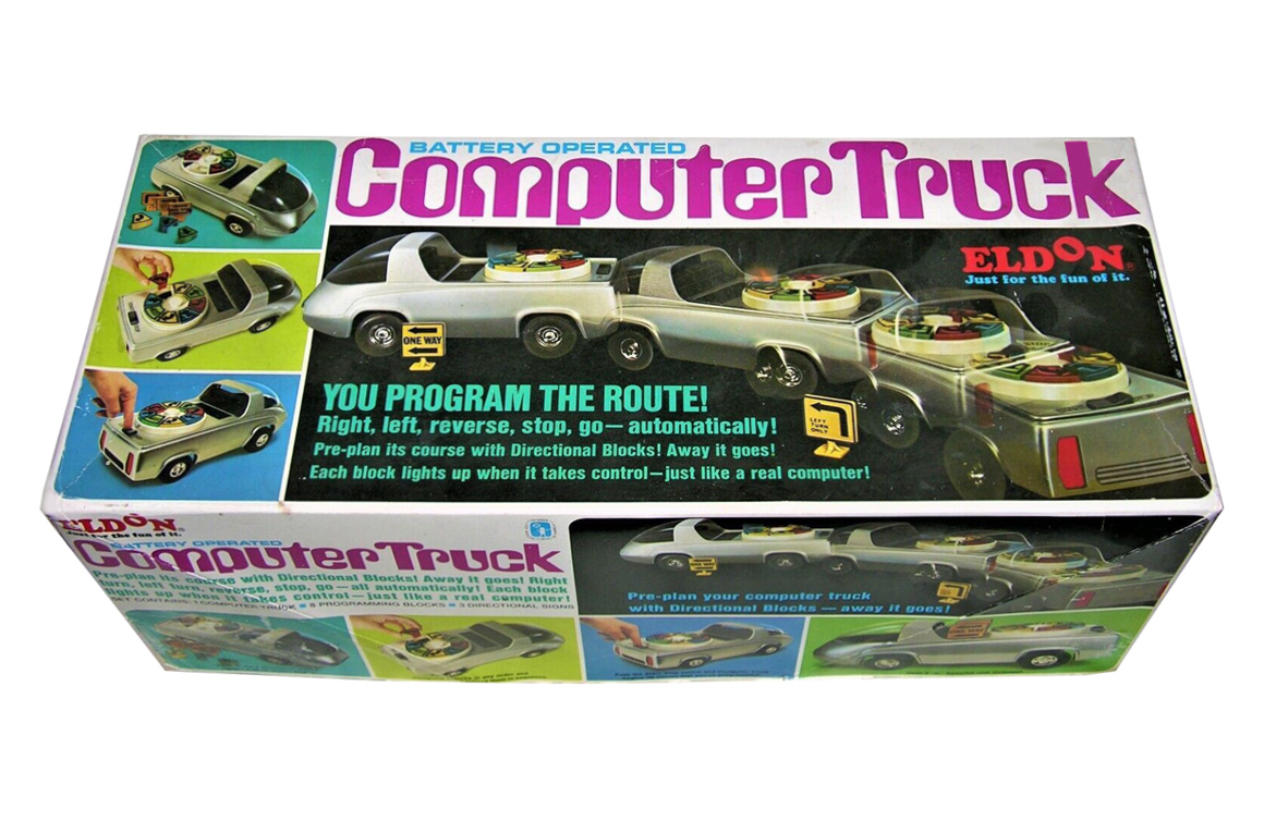 Released in 1970 by Eldon, the Computer Truck was a battery-operated toy vehicle that allowed children to program its movement using directional blocks. Marketed as a toy that “reflects today’s age of electronics,” it let kids pre-plan the truck’s route and watch it follow the programmed sequence automatically.