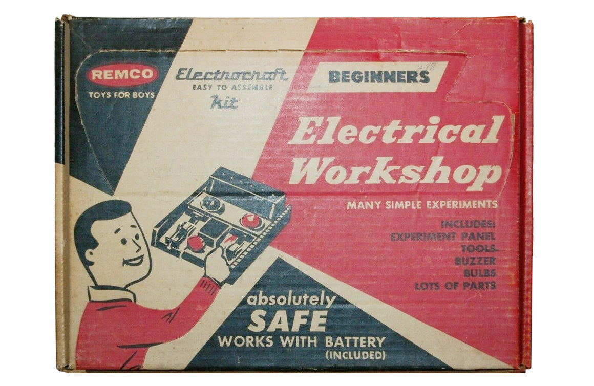 Remco’s instruction book for the kit provided a series of “electrical workshop jobs,” such as the Flashlight and Searchlight circuits and a telegraph buzzer. All parts were designed to mount securely to the test panel, allowing users to wire, test, and adjust each project safely.
