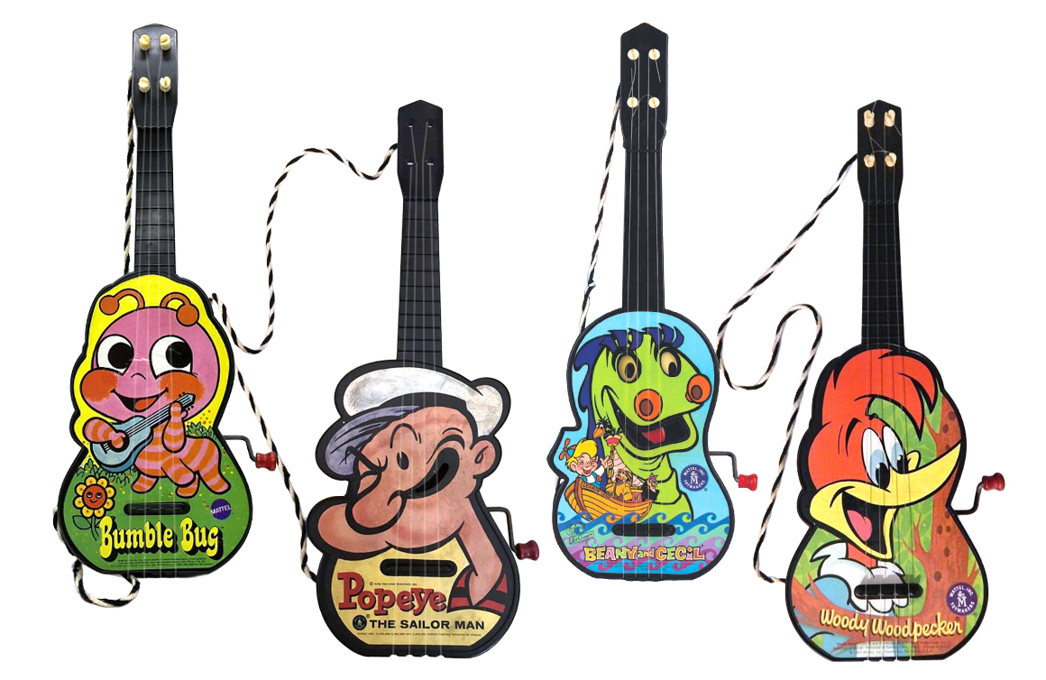 Early examples included the Cowboy Ge-Tar, which featured western imagery and played songs such as “Bury Me Not on the Lone Prairie” and “Red River.” Beginning in the mid-1950s, Mattel expanded the line with character-themed editions. These included versions featuring Mickey Mouse, Popeye, Davy Crockett, Snoopy, Winnie-the-Pooh, Bugs Bunny, Porky Pig, Cat in the Hat, Barbie, and many others.
