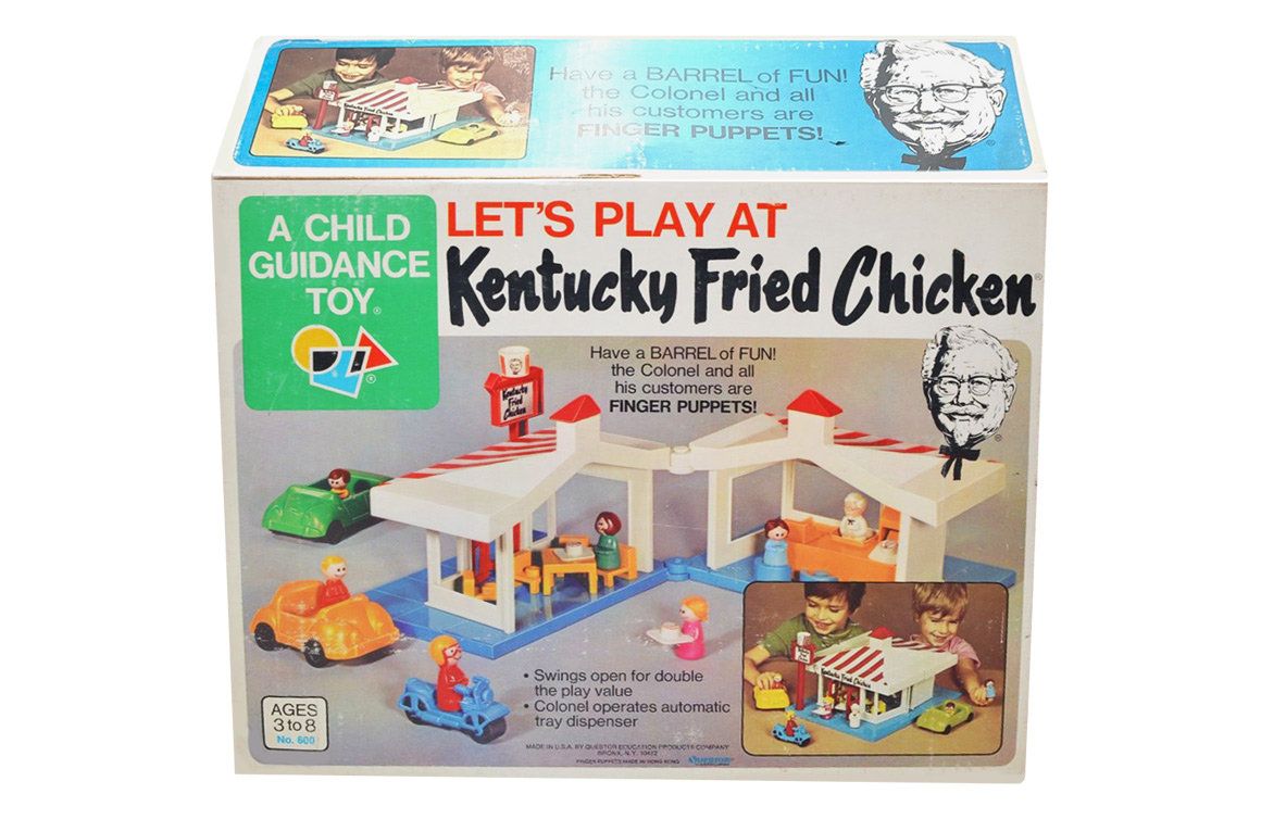 Released in 1975 by Child Guidance, the Kentucky Fried Chicken playset brought the fast-food chain into children’s playrooms, allowing them to recreate familiar dining experiences through imaginative play. The activity toy was designed to reflect the restaurant’s branding of that era, including a Colonel Sanders-illustrated bucket mounted atop a tall roadside sign.