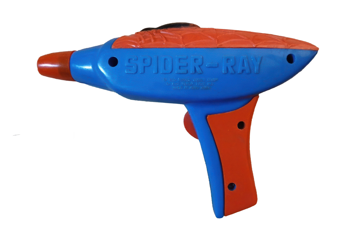 The Sting-Ray Gun featured an electro-mechanical “sting” sound effect described on the packaging as an “eerie electronic noise that would scare off enemies.” A built-in Project-A-Light beam projected a large Spider-Man symbol onto walls and other surfaces.