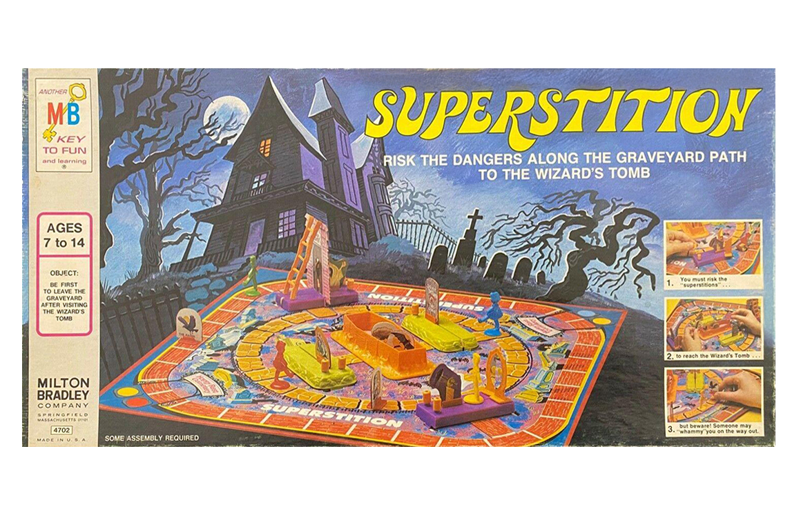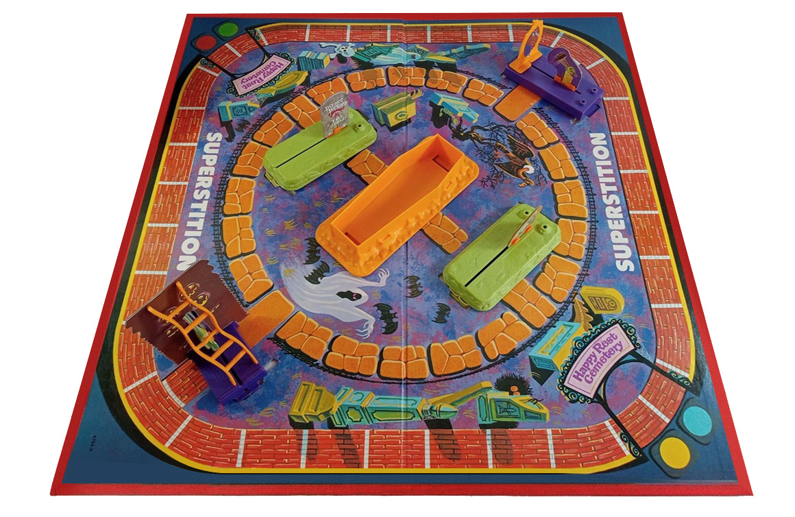 In Superstition, players raced through a haunted graveyard to reach the Wizard’s Tomb and escape before anyone else. Along the way, they faced mechanical “superstitions” such as broken mirrors, black cats, and open graves that could spring to life if the wrong peg was pulled.