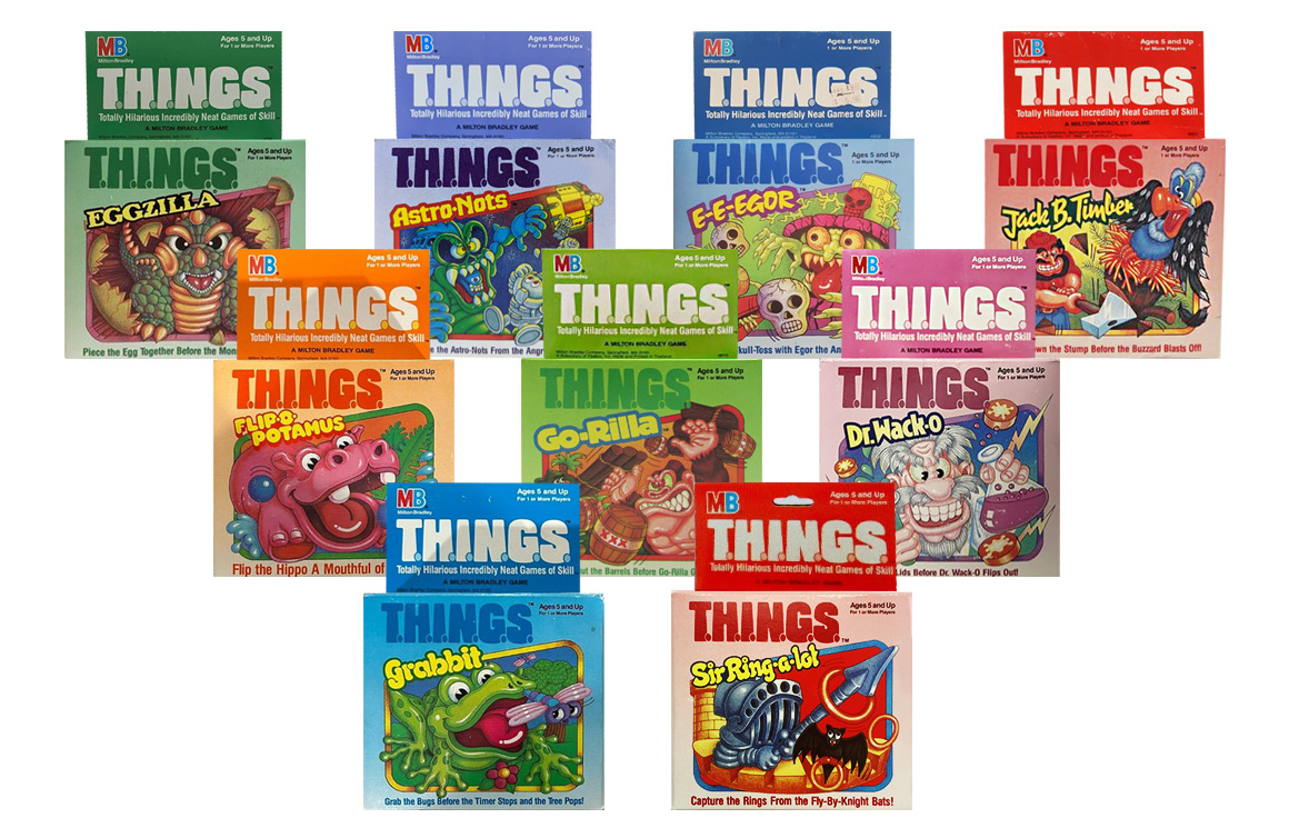 In 1986 and 1987, Milton Bradley introduced a line of one-player action and puzzle games called T.H.I.N.G.S., short for Totally Hilarious Incredibly Neat Games of Skill. Each game used a timer to create a short challenge, with the object always to finish the task before time ran out.