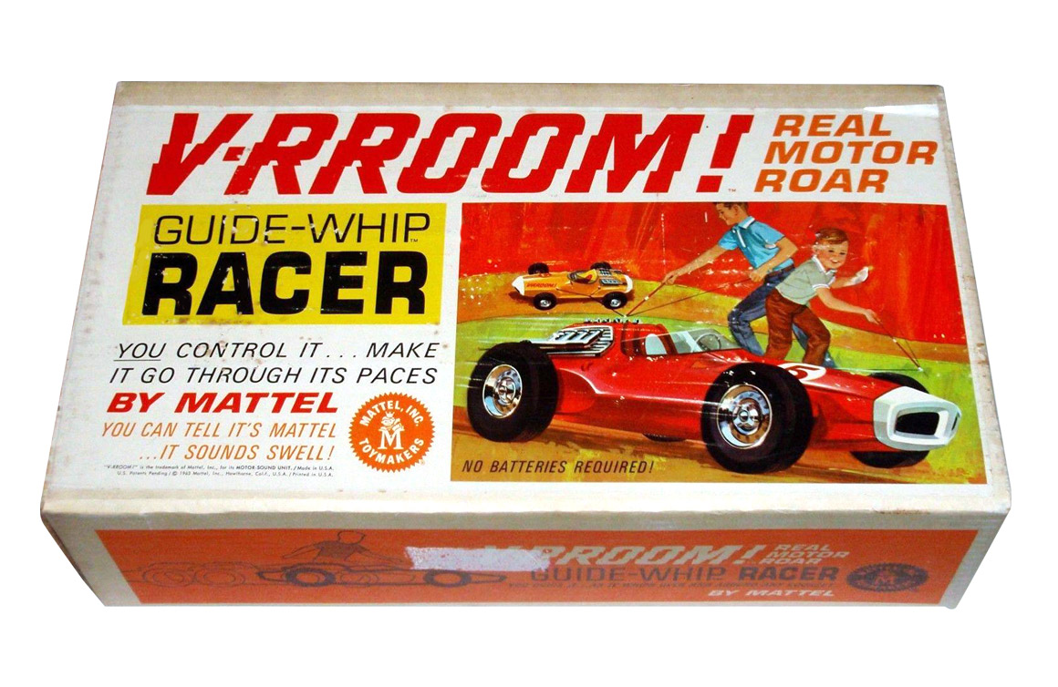 Released in 1964, Mattel’s V-RROOM Guide-Whip Racer (#0589) was a manually powered vehicle designed to simulate the sound and feel of real speedway racing without batteries. Part of Mattel’s short-lived V-RROOM line, the toy relied on motion rather than electronics to produce its signature effect.